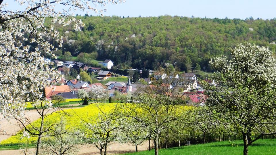 Mönchzell hat eine windgeschützte Nestlage. Im Frühjahr verzaubert die Ostbaumblüte den Kraichgau in ein Paradies. Das Bild stammt von Max Stuhr und wurde am 20. April 2016 aufgenommen. Das Lokalklima im windgeschützten Mönchzeller Kessel ist