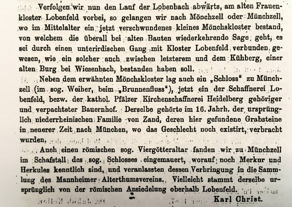 Karl Christ, der Ziegelhausener Heimatforscher, beschreibt in den „Jahrbüchern des Vereins für Alterthumsfreunde im Rheinlande“ im Jahre 1887 seine Entdeckungen in Mönchzell (Jahrbücher Jahr 1887, Heft 83 Seite 239).