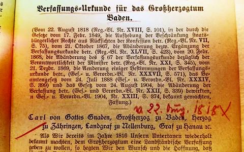 Ausgearbeitet hat die Verfassungs der Karlsruher Karl Friedrich Nebenius, nach dem die Heidelberger Nebeniusstraße benannt ist. Die Badische Verfassung wurde von Großherzog Carl am 22. August 1818 in Bad Griesbach im Schwarzwald unterzeichnet. Sie galt als eine der modernsten Verfassungen im Deutschen Bund, garantierte die doch schon Grundrechte und ein liberales Wahlrecht für 2/3 der männlichen Erwachsenen. Das waren allerdings nur 17 Prozent der Gesamtbevölkerung.