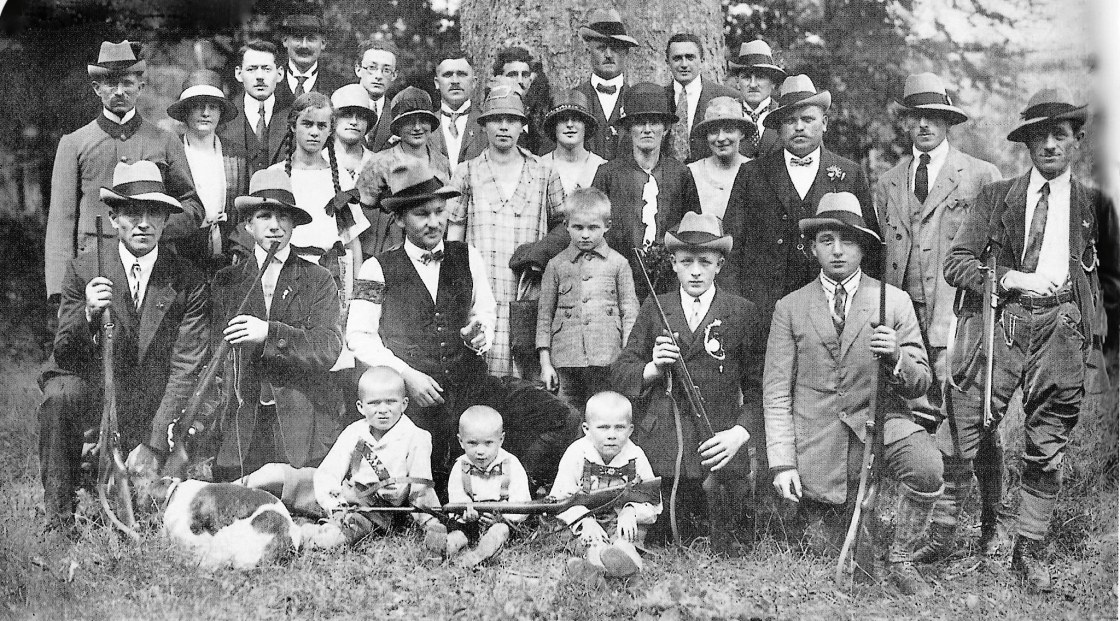 Der Schützenverein Meckesheim in seinem Gründerjahr 1924 mit seinem 1. Vorsitzenden Hermann Müller und dem Chef-Organisator Jakob Scholl an der Spitze. Das erste Kind links ist Arno Beckmann, das Kind rechts ist Günther Beckmann, der Vater des Meckesheimer Regionalfilmers Arno Beckmann. Arno Beckmann war sein Onkel, nach